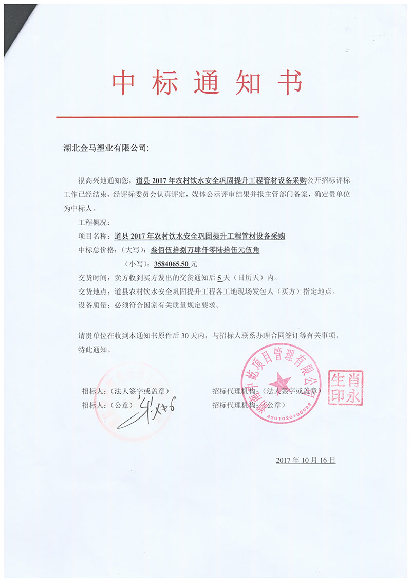 湖北祝賀金馬塑業(yè)中標(biāo)湖南省道縣農(nóng)村飲水安全鞏固提升工程管材設(shè)備