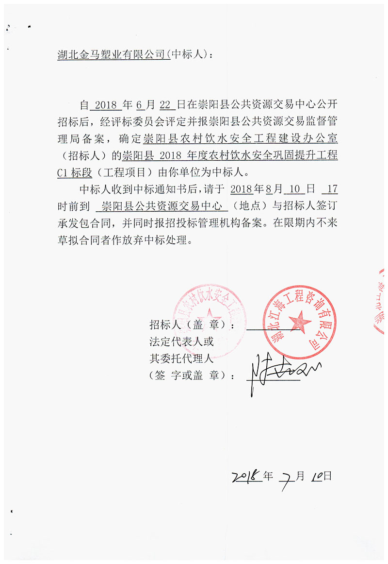湖北祝賀金馬塑業(yè)中標(biāo)崇陽(yáng)縣2018年度農(nóng)村飲水安全鞏固提升工程